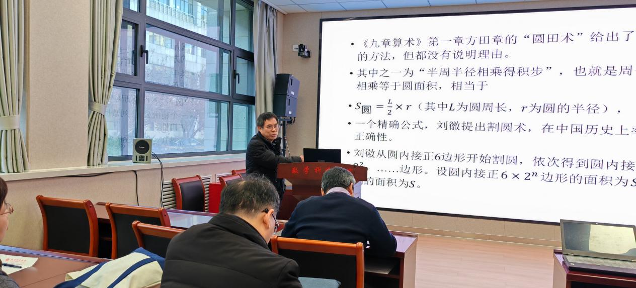 11月26日上午,公司研究生学术前沿讲座在博理楼B108举行。中国科公司自然科学史研究所博士生导师、国际科学史研究院通讯院士邹大海研究员以“数学大师刘徽的数学成就、思想方法和科学精神”为题作报告。科学技术史与文化遗产研究院、365英国上市公司、教育学部等师生代表60多人参加。科学技术史与文化遗产研究院经理郭龙建教授主持讲座。讲座前,郭龙健教授、数学科学公司党委副书记、经理常慧宾与邹大海研究员就科技史团队建设展开深入交流。
