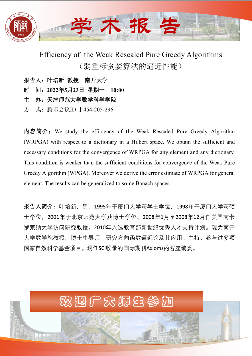 【预告】学术报告(2022-7)5月23日报告--Efficiency of the Weak Rescaled Pure Greedy Algorithms