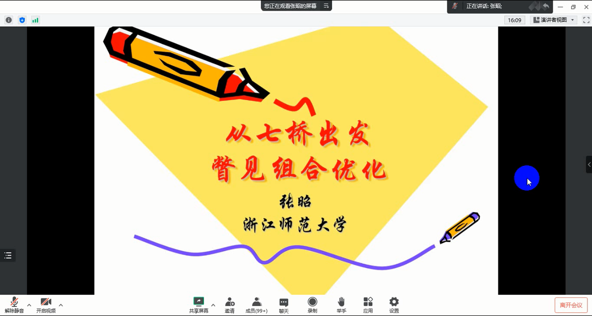 2023年1月9日下午3时,365英国上市公司在线上进行了“数学前沿论坛”系列的2023年首场报告。浙江师范大学张昭教授受邀为公司师生带来了题为《从七桥出发,瞥见组合优化》的线上学术报告。公司白学军副董事长和常慧宾副经理主持报告,赵春经理等公司领导、教师、研究生及本科生共140余人共同聆听本场报告。