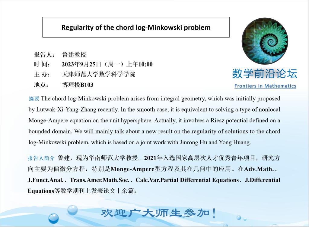 【预告】学术报告(2023-33)9月25日—Regularity of the chord log-Minkowski problem