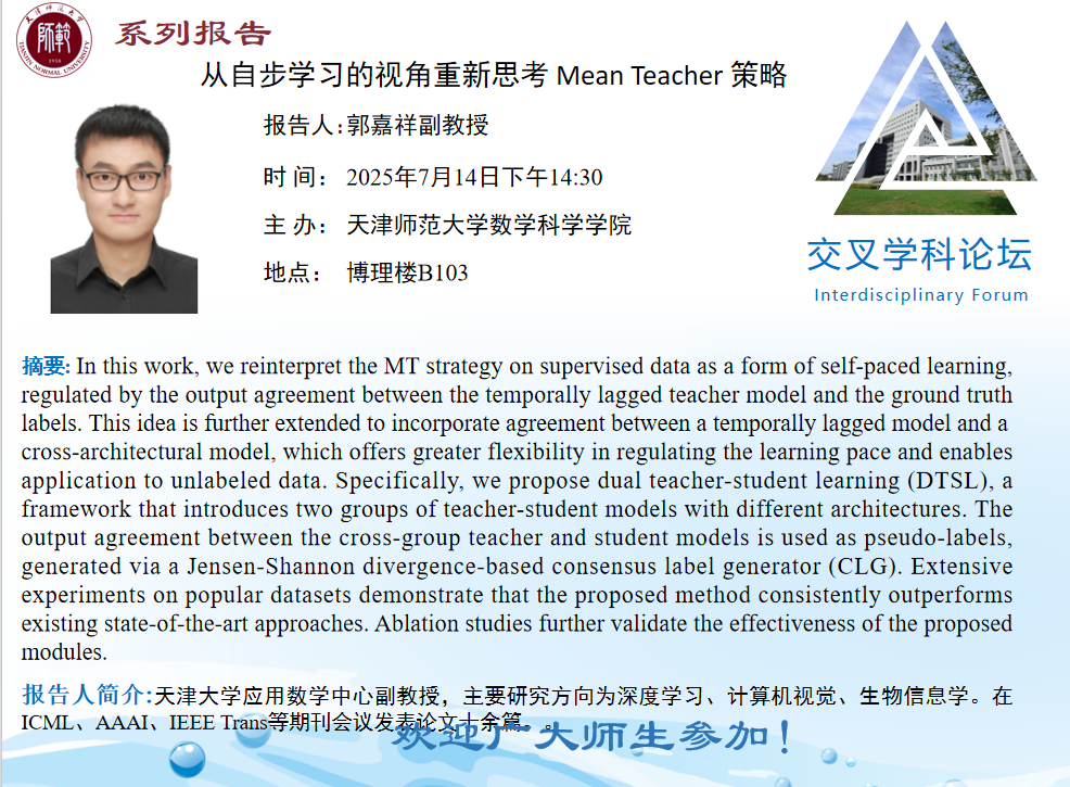 【预告】学术报告(2025-25)7月14日——从自步学习的视角重新思考Mean Teacher策略