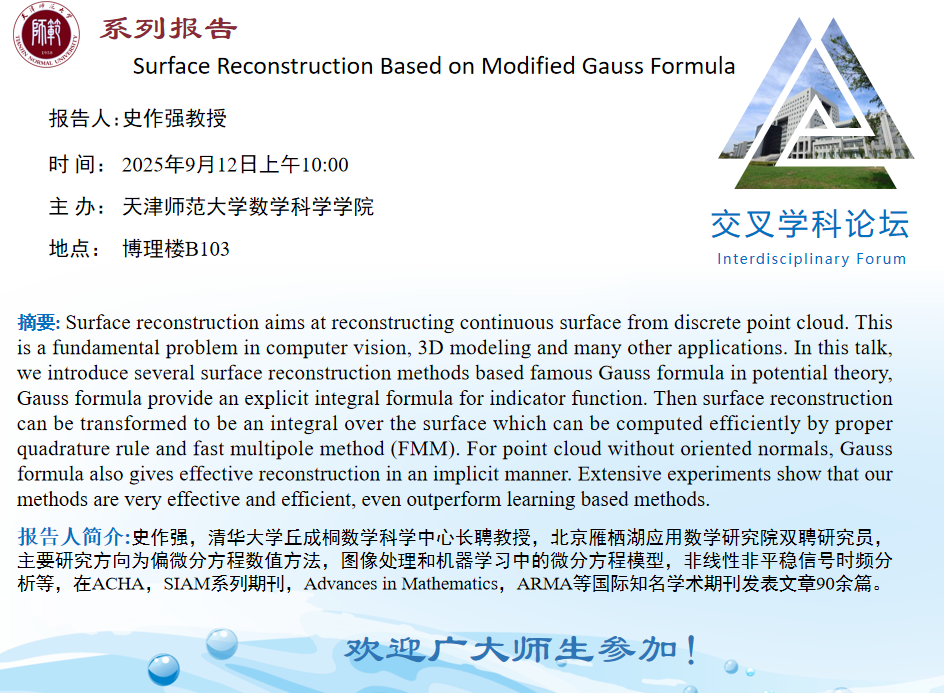 【预告】学术报告(2025-31)9月12日-Surface Reconstruction Based on Modified Gauss Formula