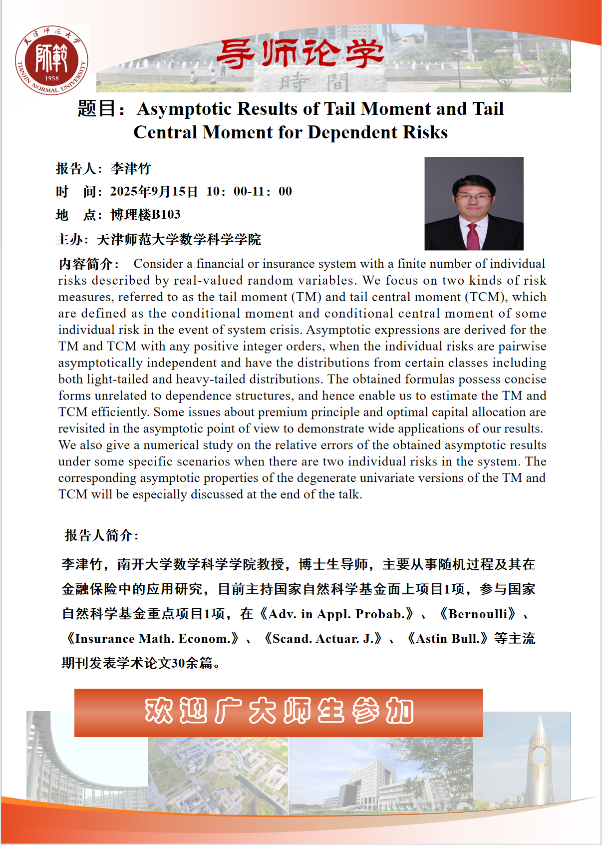 【预告】学术报告(2025-37)9月15日-Asymptotic Results of Tail Moment and Tail Central Moment for Dependent Risks