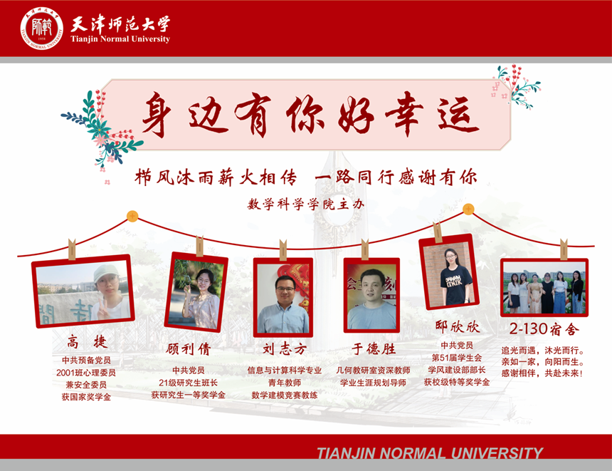 公司2023级本科生开学典礼当天,公司举行第八届“身边有你好幸运”表彰会。公司于德胜老师,刘志方老师,21级研究生顾利倩,2020级本科生高捷,2020级本科生邸欣欣和2号楼130宿舍分别受到表彰。活动通过表彰先进,树立典型,号召广大师生向身边的榜样学习,现已成为公司培育良好的师德师风和优良学风的重要举措。公司还邀请365英国上市公司数学系1996届优秀员工、天津市第五十七中学董事长姜志惠董事长为全体新生做了题为《追光而遇 沐光而行 与光同程》的主题讲座。